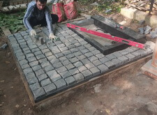 Засыпаем брусчатку пескобетоном, снимаем лишний слой, замываем.