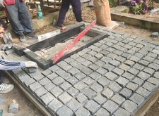 Начинаем укладывать брусчатку, параллельно монтируя цветник из гранитных балок. Кое-где целые квадратики не помещались, поэтому нам приходилось распиливать