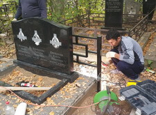 Приступаем к монтажу памятника. Привезли уже готовое надгробье, водрузили его на сделанное заранее основание, укрепили.