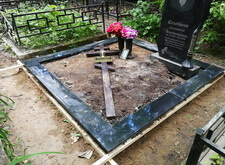 Так выглядит окончательный вариант места захоронения: памятники являются точной зеркальной копией друг друга, на землю уложена брусчатка, металлическое ограждение заменено на гранитный цоколь.