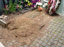 На данном участке недавно произошло дозахоронение. Это послужило для клиента решающей причиной заказать комплексный ремонт могилы, включающий в себя полное благоустройство с места захоронения. Когда мы приехали на кладбище, то действительно обнаружили на участке следы недавних раскопок.