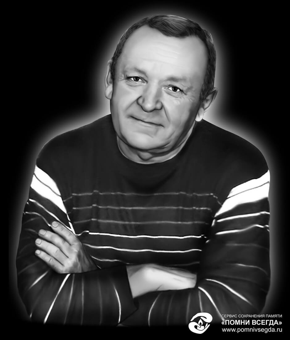 Обсудив с клиентом малейшие детали будущего портрета и его личные пожелания, мы пришли к обоюдному соглашению: в качестве основы для гравировки брать третье фото, немного дополнив его. Вскоре клиент получил результат: фотография покойного в чёрно-белых тонах со специально проявленными для более точной гравировки чертами лица. Помимо этого, к портрету был добавлен небольшой белый ореол.