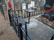 Пришло время окончательной отделки: мы затерли все швы герметиком, протерли плиты от следов цемента, помыли ограду, лавочку и столик, прикрыли землю в цветнике. Место захоронения готово к сдаче заказчику.