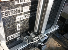 Далее вы можете видеть процесс гравировки надписи на стоячем памятнике. Редкие смельчаки отваживаются на подобную работу. Любая ошибка грозит тем, что нужно будет полировать весь камень, а сделать это руками на месте не всегда возможно, а если и возможно, то ручная полировка всегда хуже полировки на станке. А ни один клиент не хотел бы платить деньги за работу, после которой плита будет хуже, чем до проведения работ. Как вы можете видеть, мы умеем делать такую сложную работу.